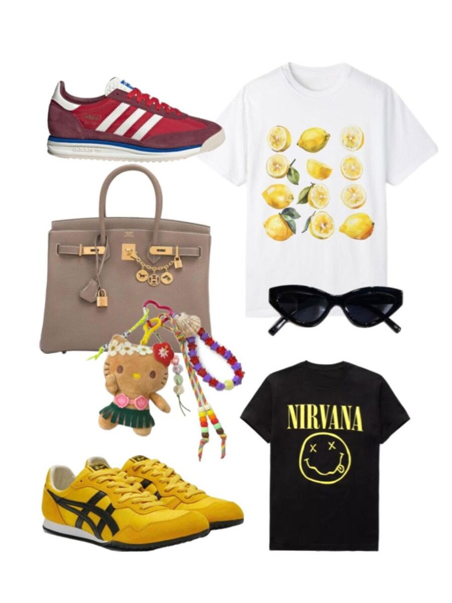 Let’s have a closer look at, graphic tees, colorful sneakers, and bag accessories.