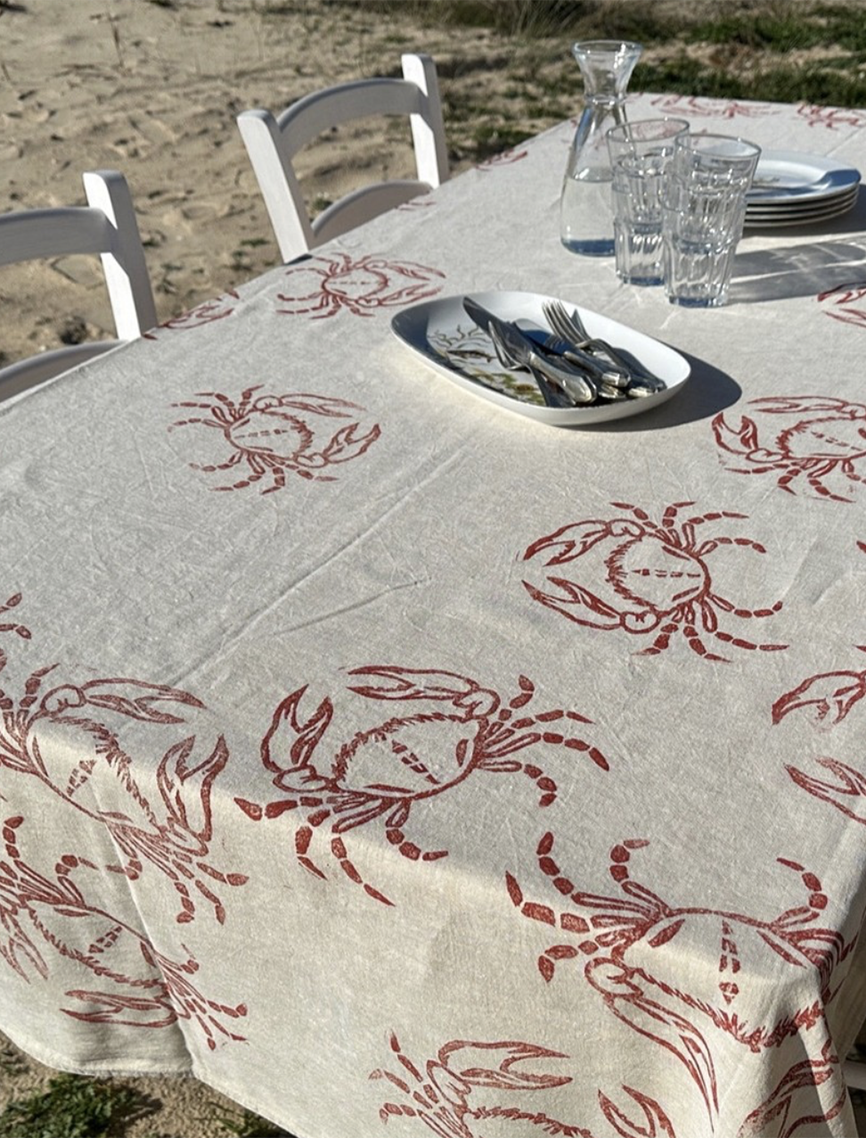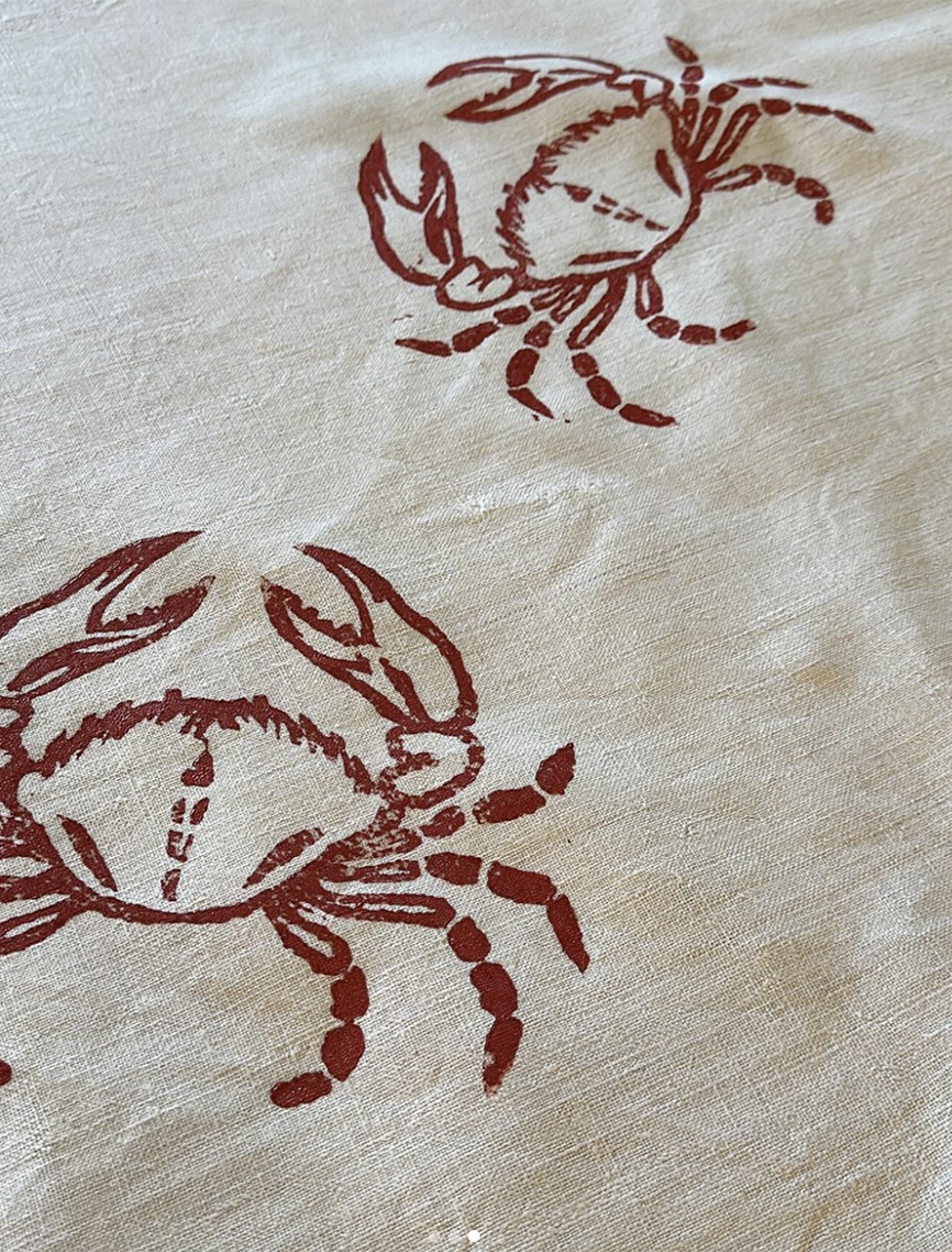 Con l'aiuto di un artista locale del legno, sono passato rapidamente alla stampa a blocchi, e non ho mai guardato indietro. Prendo ispirazione da tutto ciò che vive nel mare qui, tutte queste bellissime creature. Ho scelto le tovaglie come mio mezzo perché simboleggiano lo stile di vita portoghese. Sono molto grato ai miei amici portoghesi, che mi hanno mostrato che rallentare e godersi il pranzo con gli amici è una delle cose più essenziali della vita.