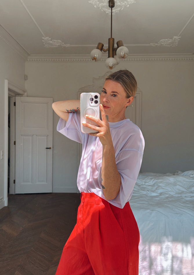 Person wearing a lavender top and bright red pants taking a mirror selfie in a bedroom.