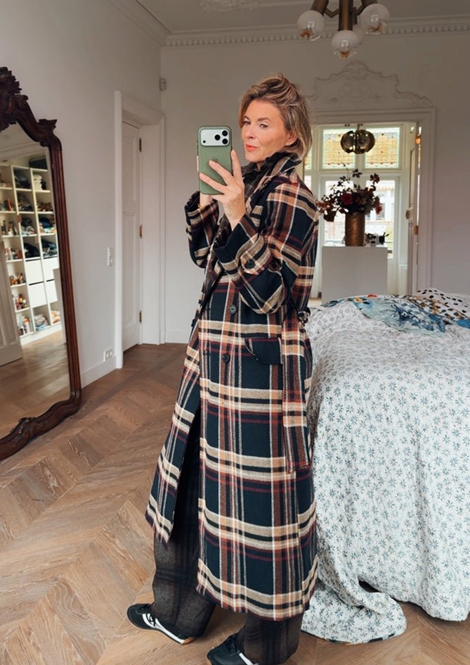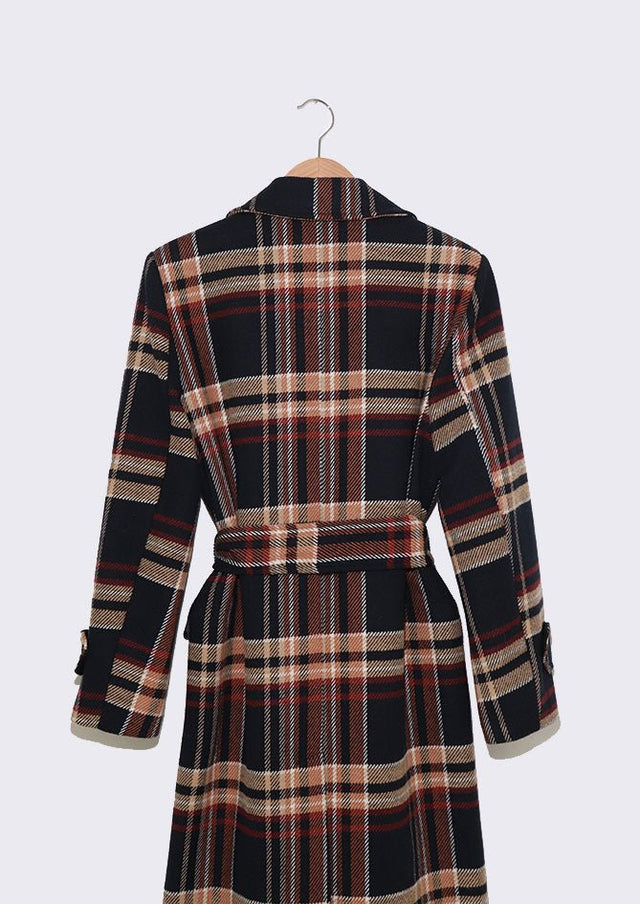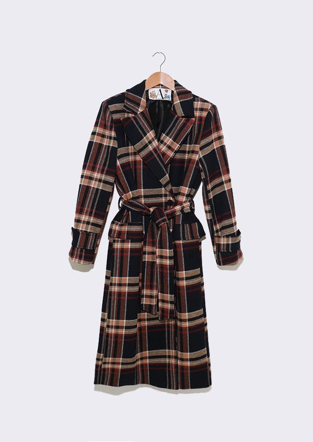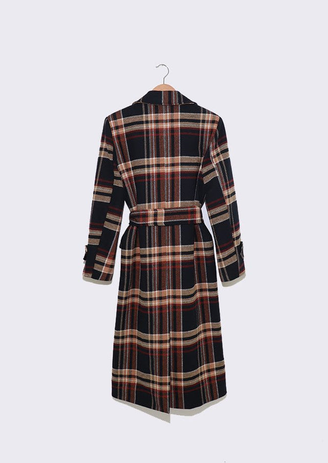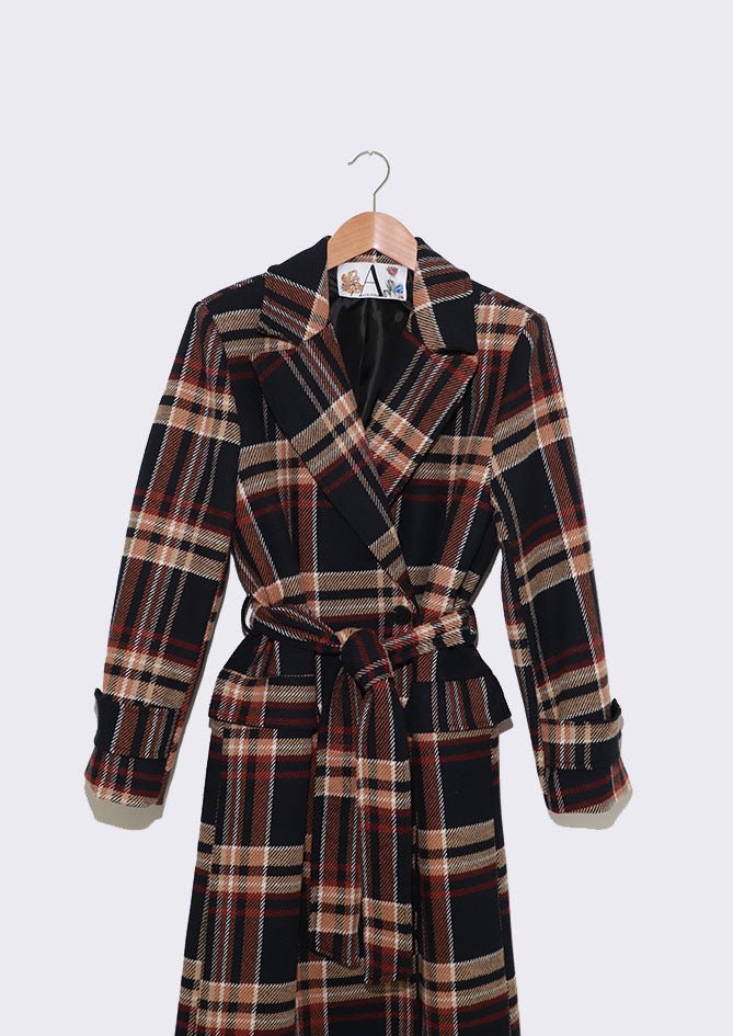 This long coat features a classic checked pattern crafted from a comfortable cotton blend yarn. It includes a lapel collar, flap pockets, and a double-breasted button closure. An adjustable waist belt enhances the fit, while the inner lining and black slit add refined details. Available in regular fit and sizes S, M, and L.